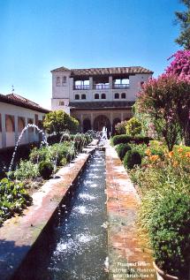 Les souverains Nasrides possédaient, en dehors des murailles de la cité fortifiée de l'Alhambra, de nombreuses propriétés. L'une d'entre-elles, certainement la mieux conservée, est le palais d'été du "Generalife", dont le nom proviendrait du nom Arabe de l'ensemble : "Jannat al-arifa". Situé sur un flanc de colline, à quelques centaines de mètres à l'Est des murailles de la cité de l'Alhambra, cet ensemble se compose de plusieurs corps de bâtiments entourés de jardins d'agrément et de jardins potagers, cultivés jusqu'à nos jours. Le palais du Generalife, que l'on découvre sur la photo ci-contre, possède un patio alongé pourvu d'un canal autour duquel se répartissent de petits jardins. Ici aussi un système hydraulique agrémente ce patio, lui conférant un charme particulier. Depuis les fenêtres du palais on découvre une vue légèrement plongeante sur la cité de l'Alhambra et une magnifique vue sur la ville de Grenade. |