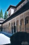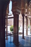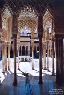 Des piliers de marbre d'une grande finesse élèvent les portiques extrêment ouvragés. Seuls, ou regroupés par deux, trois ou quatres, ces piliers supportent d'élégantes voutes à mouqarnas dont les pleins sont découpés comme de la dentelle fine. Deux pavillons à portiques s'avancent dans la cour, se faisant face, donnant un forme de H à la cour et jouant dans la lumière d'une manière très esthétique... |