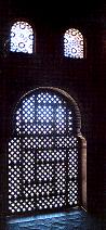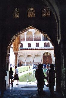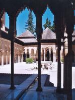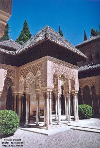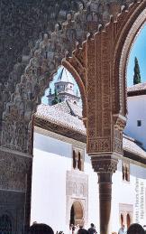 Cette cour précède la tour des "Comares", la plus haute tour de l'Alhambra, qui abrite la célèbre grande salle des ambassadeurs, salle du trône de Youssouf Ier (1333-1354). Elle tient son nom arabe d'"alberca" de son large bassin qui reflète harmonieusement l'architecture des bâtiments qui l'entourent. Ce bassin de forme rectangulaire, de presque 35m de long sur plus de 7m de large et qui occupe une grande partie de la surface de la cour, confère à celle-ci une dimension supérieure. Le système d'alimentation en eau a été étudié afin de composer une surface d'eau lisse comme un miroir, à tel point que les poètes arabes l'évoquèrent comme "la mer". Son nom de "cour des myrtes" provient des deux haies qui bordent actuellement le bassin. Autrefois, à la place des haies de myrte, l'eau du bassin abreuvait des parterres de fleurs... L 'Alhambra n'est maintenant plus qu'un musée et la beauté certainement supérieure encore des lieux d'autrefois est perdue... |