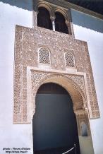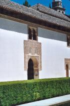 Sur les deux côtés de la cour, le long des haies, des portes richement décorées d'atauriques donnent accès aux appartements du palais. Sur la photo ci-dessus, on constate la présence de mousharabieh à l'étage. Cette partie du palais, orientée vers le Sud, est présentée comme étant l'un des appartements royaux. Cette cour est donc tout à fait typique du style Nasrides, avec sa cour rectangulaire autour de laquelle se répartissent les appartements, la pièce d'eau centrale, la présence d'un jardin paysagé: formes très sobres, intimismes, mélant les différents éléments naturels et architecturaux. |