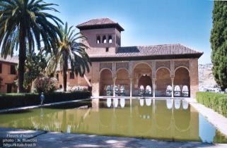 Le palais du Partal est certainement l'un des plus anciens palais de l'Alhambra. On estime qu'il pourrait avoir été édifié au début du XIVe siècle de l'ère chrétienne. Il ne subsiste de ce palais que ce corps de bâtiment très élégant, intégré dans le mur de la cité et surplombant les vieux quartiers de Grenade, la partie antérieure d'une demeure et la tour surnommée "tour des dames". Il ne reste ici que des vestiges de cet ensemble palatial et des fouilles archéologiques permettent d'imaginer le plan originel du quartier. Ce palais qui possède un plafond de bois ouvragé se refléte dans un grand bassin rectangulaire entouré de jardins ombragés. |