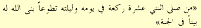 "Quiconque pratique régulièrement douze rak'ates (de prière surérogatoire) durant sa journée et sa nuit, volontairement, Allah lui bâtira une maison au Paradis". - (comme récompense)