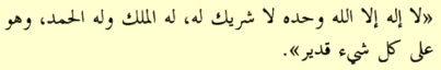 "Il n'y a pas d'autre divinité sauf Allah, Unique sans aucun associé; à Lui la royauté; à Lui les louanges; Il est le Plus Puissant sur toutes choses".