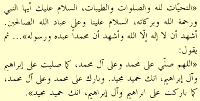 "Les salutations sont pour Allah, ainsi que les prières et les oeuvres bonnes; que la paix soit sur toi, ô Prophète ainsi que la miséricorde d'Allah et Ses bénédictions; que le salut soit sur nous et sur les bons serviteurs-adorateurs d'Allah. Je témoigne qu'il n'y a pas d'autre divinité sauf Allah; et je témoigne que Mohammad est Son serviteur-adorateur et Son Envoyé Messager".