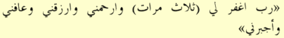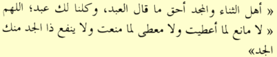 "Ô Allah, Tu es le plus digne de louanges et de gloire, comme le dit à juste raison ton serviteur-adorateur, et nous sommes tous tes serviteurs-adorateurs. Ô Seigneur (Allah) ! Nul ne peut empêcher ce que Tu accorde; nul ne peut donner ce que Tu empêche, et aucun fortuné ne peut profiter de sa chance à Ton insu".
