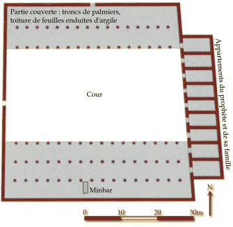 Entourée de murs de pierre et de briques d'argile, la bâtisse très simple abritait une grande cour de sable. Il semble que les dimensions importantes de cette construction étaient courantes pour les bâtisses de l'époque, certains chameliers faisant entrer leurs troupeaux dans la cour de leur maison. Côté Nord et Sud de cette cour, de larges auvents couverts de feuilles de palmier enduites d'argile et soutenus par des troncs de palmiers prodiguaient de l'ombre. A l'Est, les appartements du prophète ( C'est dans la cour que le prophète Muhammad ( |
