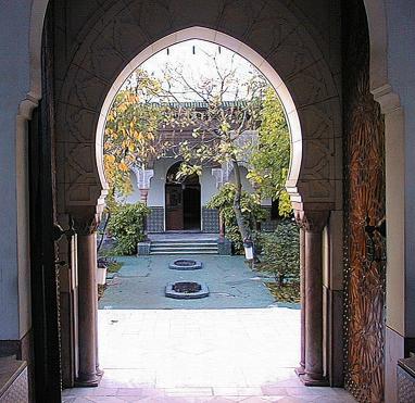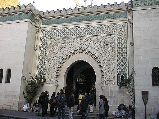 La grande porte de la mosquée de Paris est ornée de motifs floraux stylisés dans le plus pur genre islamique.